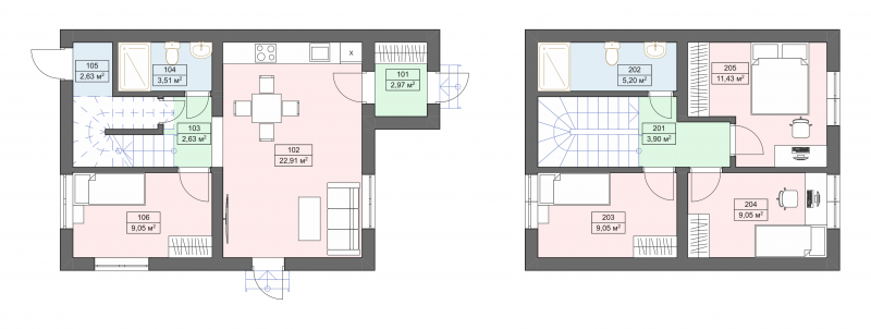 Компактный двухэтажный дом с оригинальными комбинированными фасадами выполненными декоративной штукатуркой, двухскатной практичной кровлей. Имеет четыре спальни, кухню гостиную, котельную, постирочную, второй санузел, вместительный теплый тамбур, удобное кладовое помещение с отдельным выходом на задний двор.